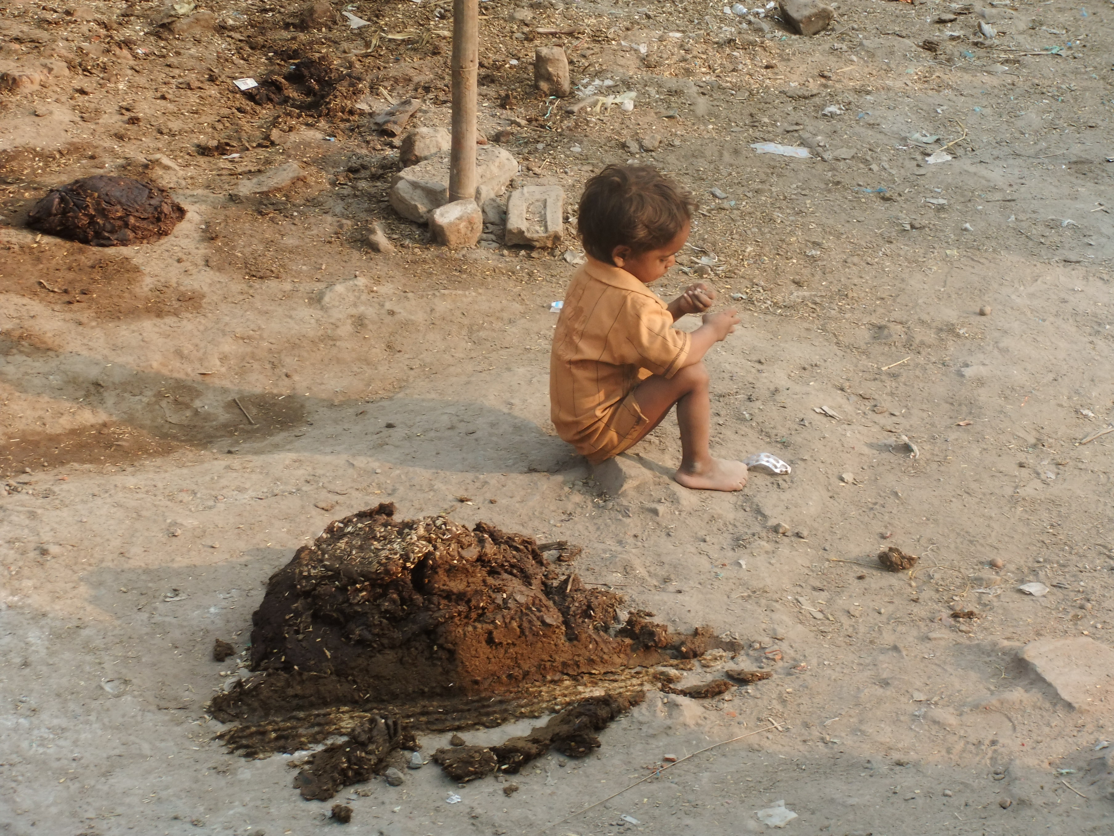 子供より大きい牛のウンチ、ウンチを踏まないで歩くことはむずかしいです。
