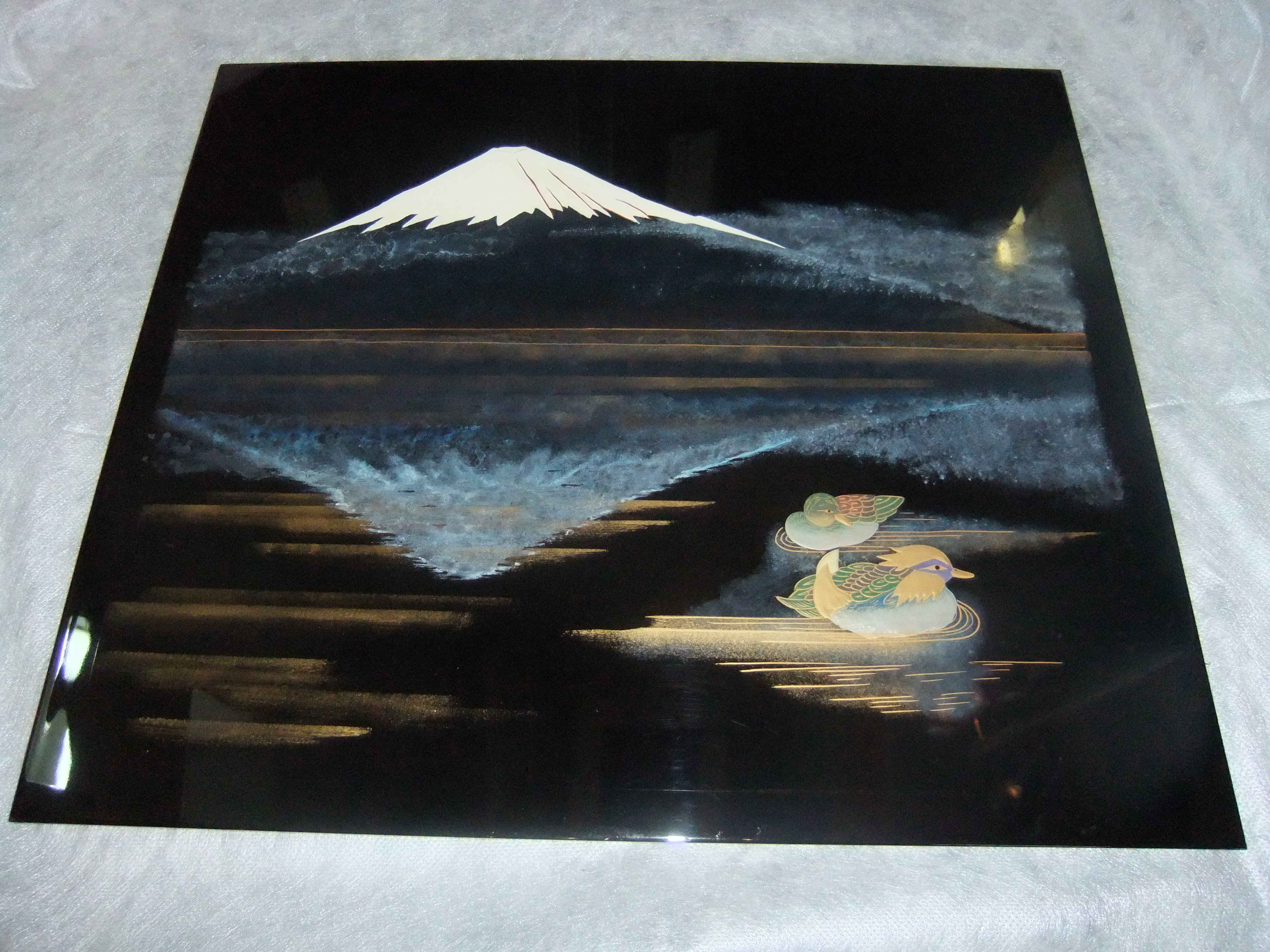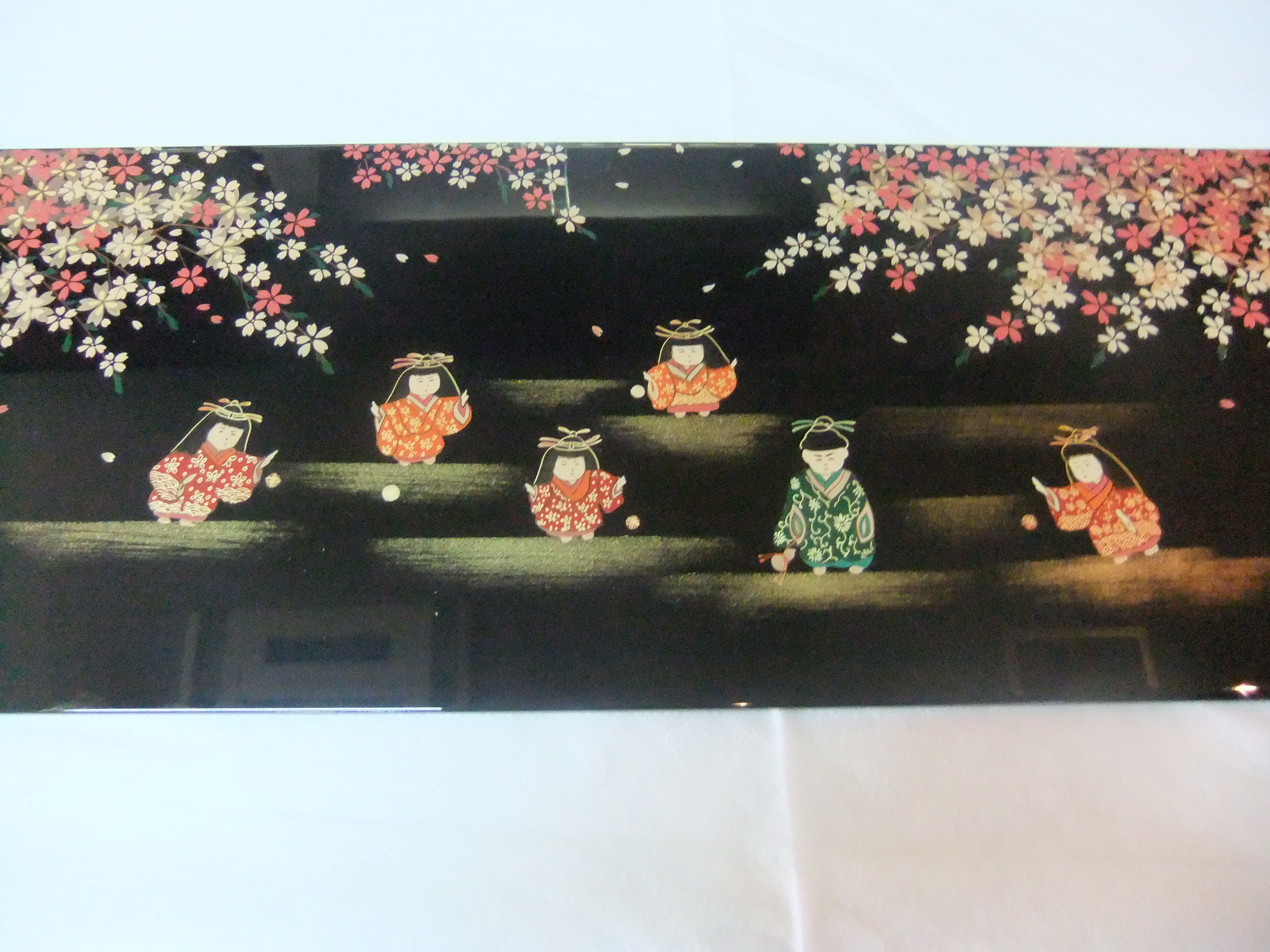 特別注文の金仏壇の座に置く蒔絵板を依頼していました。施主様のご要望で一枚は「富士とおしどり」をそしてもう一枚は「満開の桜の下で遊ぶ童(兄弟)」の構図です。この絵は施主様がお亡くなりになられたお母様を偲んでご希望されました。