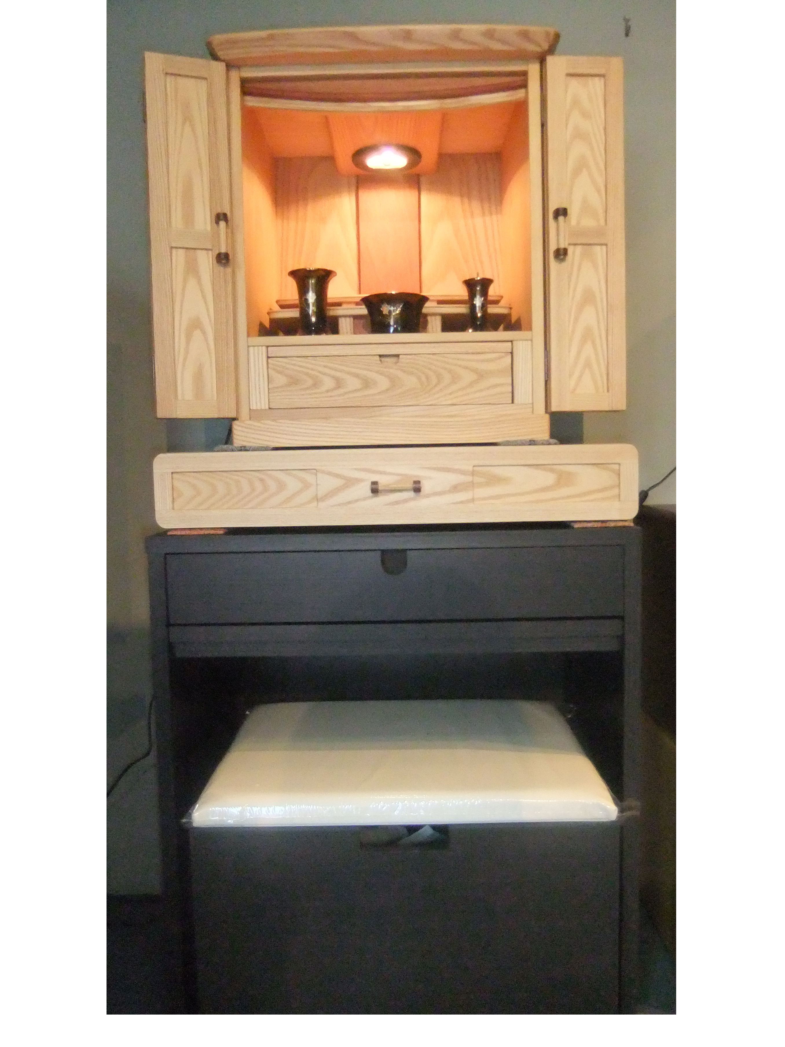 この夏の新作です。 うっとおしい梅雨ももうしばらく続きそうですね。また、今年は節電がさらに求められ厳しい夏を過ごさなければならないかも知れません。せめてお家の中を少しでも涼しげにしたいものです。 そこで登場したのは白木の素材観をそのまま生かしたお仏壇です。とても清涼感がありきれいです。特に生活スタイルや住宅をナチュラル嗜好で選ぶお客様にはぴったりでしょう。 ブリーズナチュラルカラー本体 (高さ405mm×巾515mm×奥行310mm)¥84,000 税込  ● 同素材のブリーズ専用台(収納付)をサービスでお付けします 写真:黒のスツール付き置き台は別売り(¥31,500)