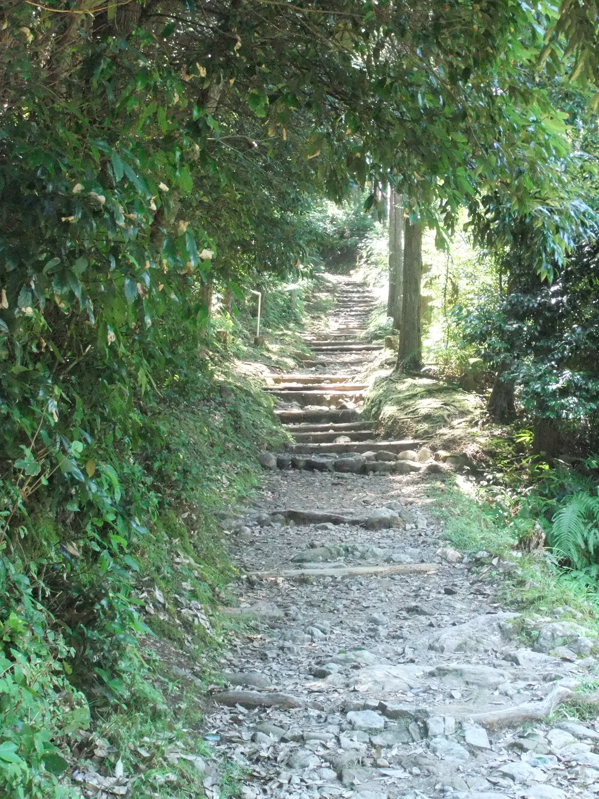 もちろん店から歩くほど休みも取れないので。ひとまず車で本宮近くの川湯温泉まで行き一泊。明朝、宿の車で熊野古道の途中(本宮まで7km地点)発心門王子まで送ってもらい、ここから熊野大社のゴールをめざしました。ゴールに近いという事で、他にも本格的な装備の登山者から子供連れの家族までおもいおもいのスタイルで多くの方が歩かれていました。しっかり歩くとかなりハードな山道ですが、何箇所かで車道に合流している箇所もあるのでちょっと雰囲気を味わうことも可能です。今回歩いた発心門からだと約3時間コースで、私のような何ちゃってハイカーにはちょうどいい距離かもしれません(笑)。但しシューズだけはちゃんとしたハイキングシューズを準備されたほうがいいと思います。スニーカーではソールが薄く石場を歩くのにはかなり苦労しました。