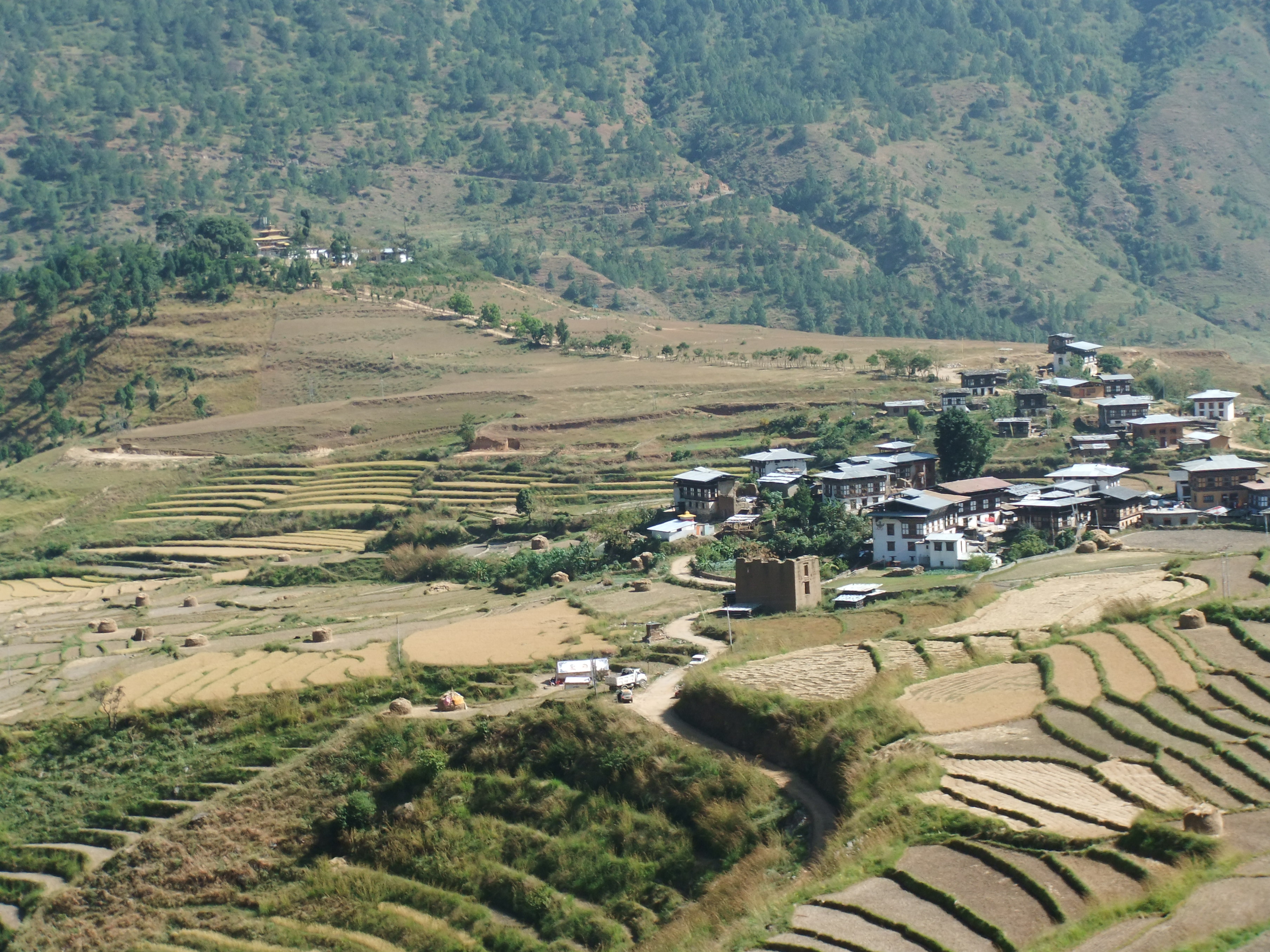 観光といえばゾンやお寺の見学、各地で行われる祭り(ツェチュ)、またヒマラヤの山々・・・でも何といってもなんにもないのどかな景色が一番です。澄んだ空気と稲刈りを終えた田んぼ、清流には魚が泳ぎます。