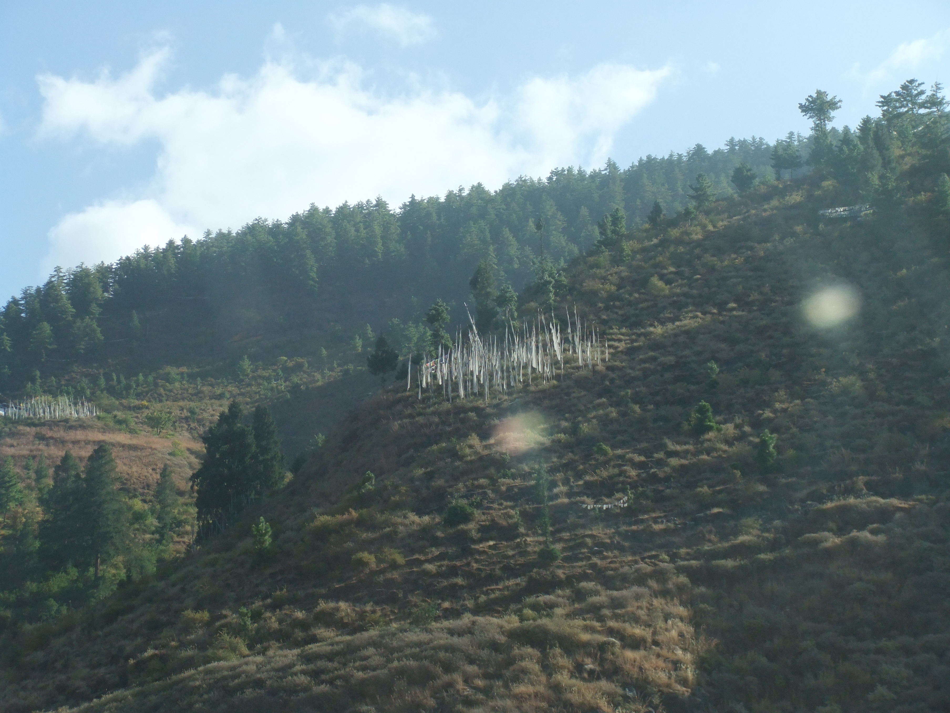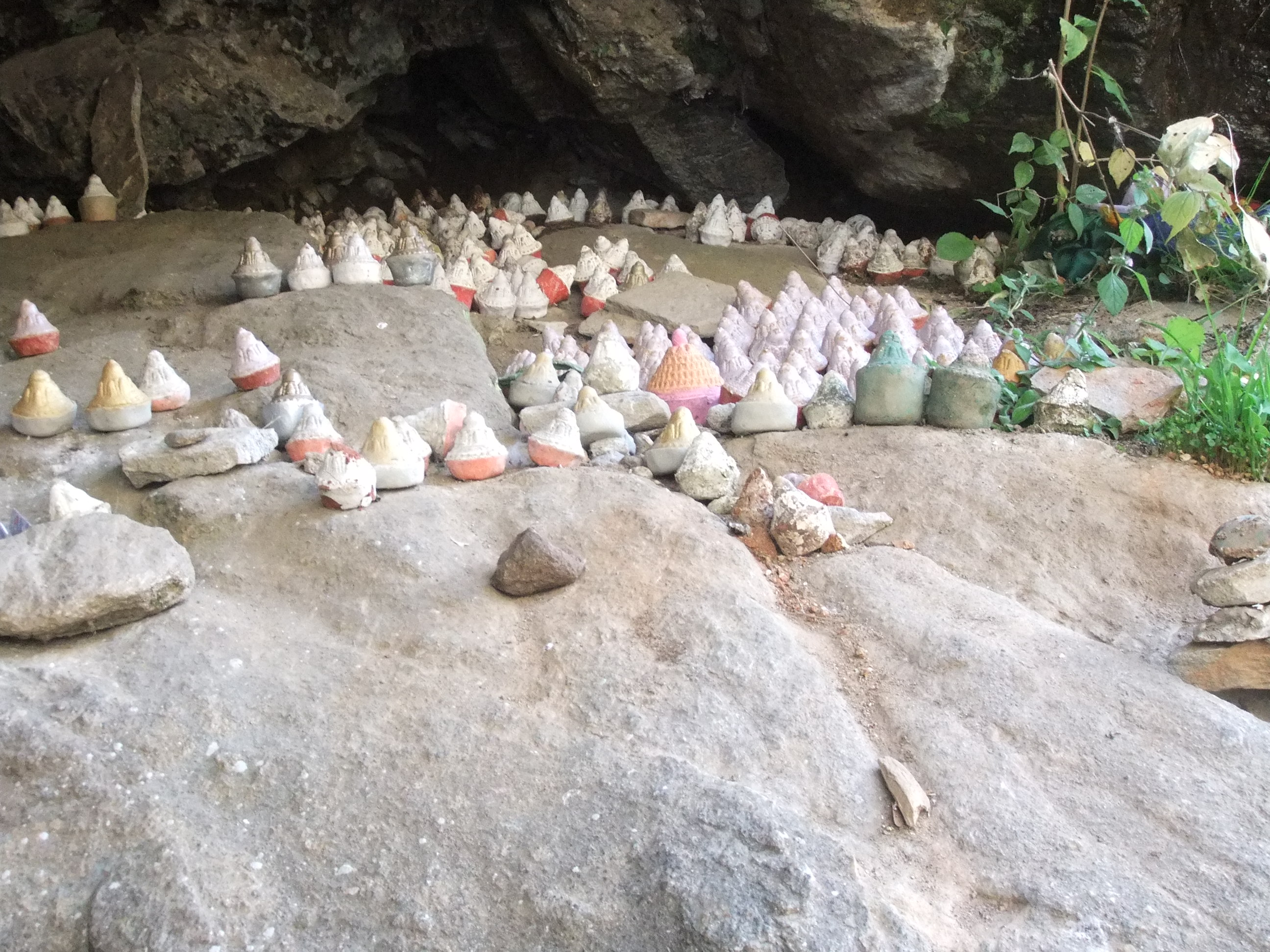 山肌に白い旗が何本も立っているのをよく見ました。これは人が亡くなったらその年の数だけ旗を立てるそうです。葬儀後火葬されて川に流されます。そのうち骨を108の小さな舎利に入れてお寺の近くに置かれます。日本の納骨と違いほんとに無造作に壁の穴とかにに並べたりしています。