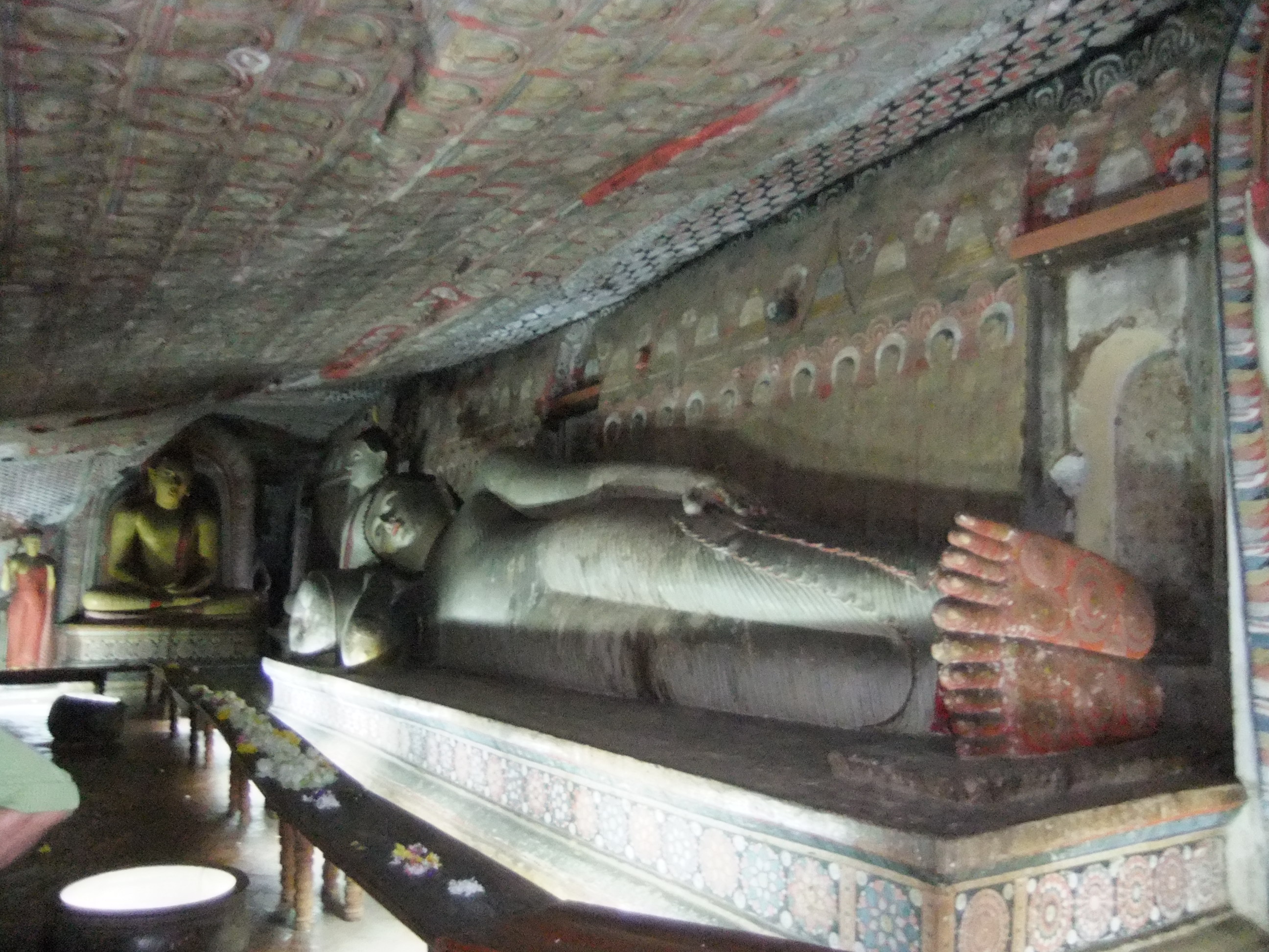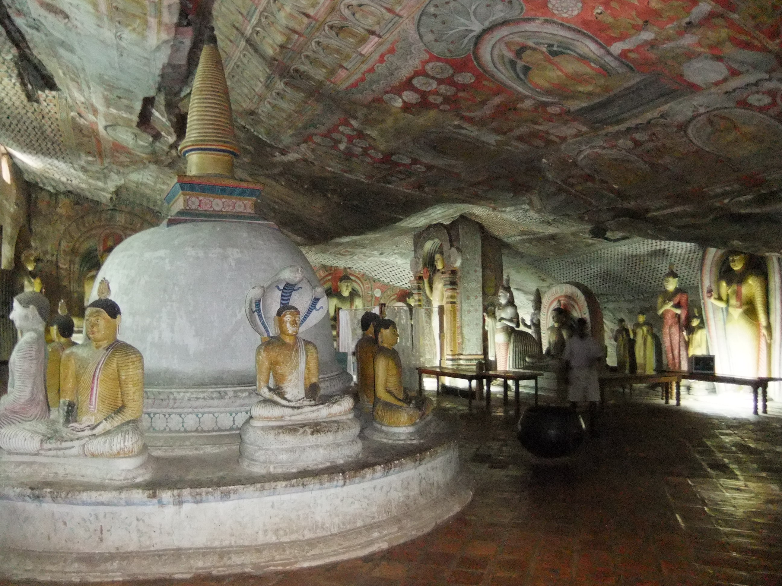 ダンブッラは、全て自然の洞窟を利用して造られた石窟寺院です。5つあるうちの第2窟からは、天井から聖なる水が湧き出しています。ダンブッラとは「聖なる水」という意味で、これが地名の由来となっています。それぞれの洞窟に多数の仏がまつられていましたが、おもしろいことに写真撮影はその仏像のみ許されて人とのツーショットは禁止されていました。きっと汚れた人間と一緒はだめなんでしょうね。