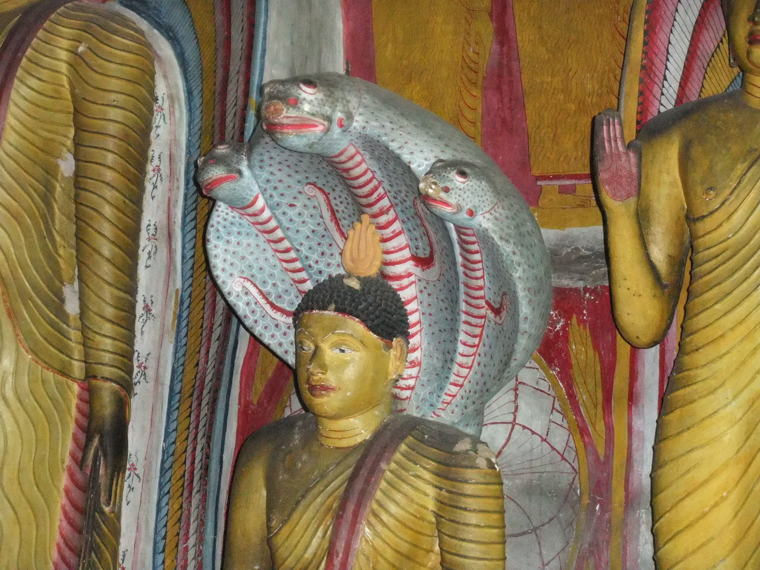こちらのお釈迦さまはコブラが覆いかぶさり光背をつくっています。コブラが仏を守る姿はスリランカではよく見かけました。