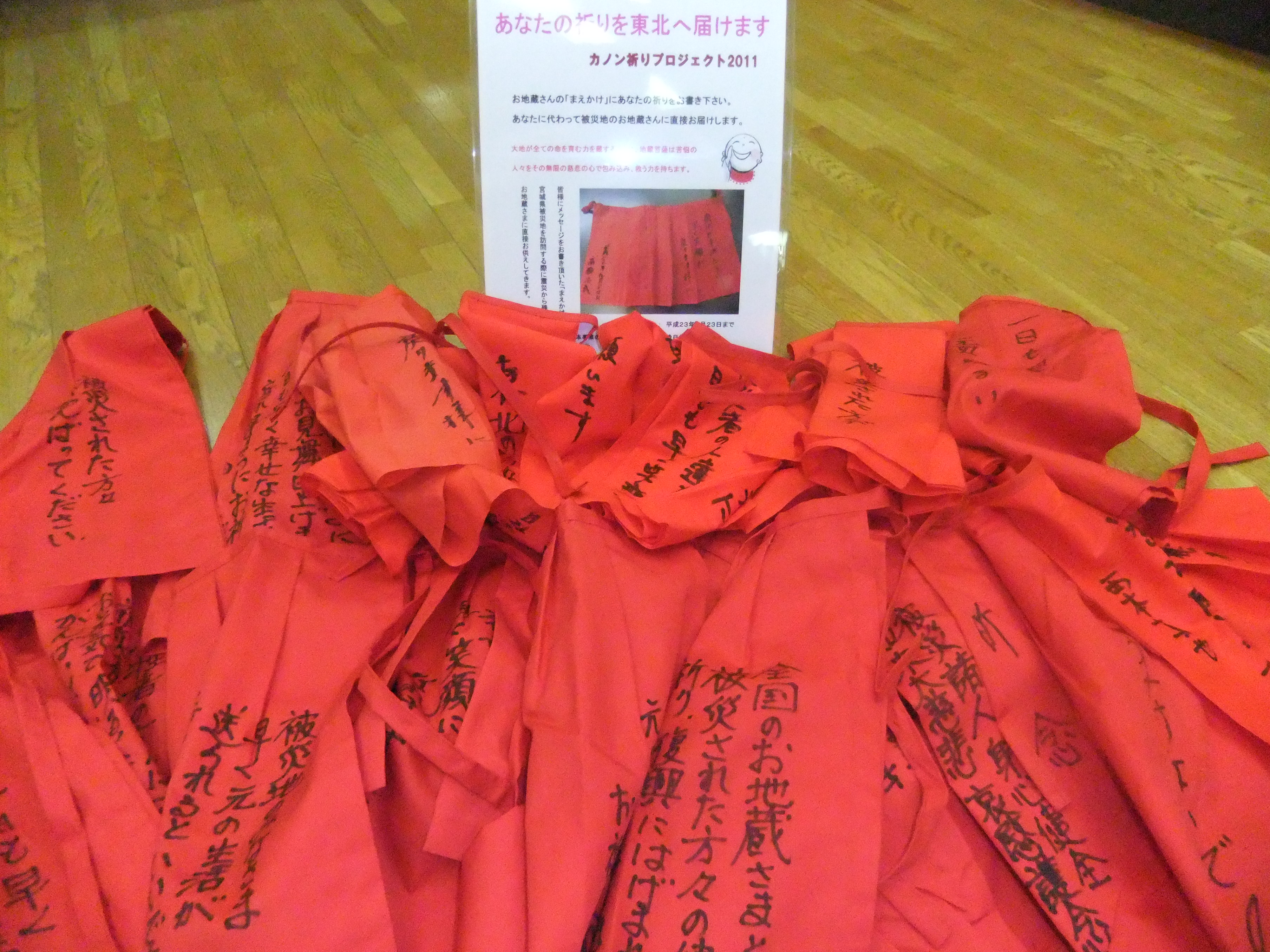 当店でも東北へのたくさんの祈りの前掛けが集まりました。 全国でこのプロジェクトに参加された方々の祈りも合わせて東北の被災地のお地蔵さんへ届けます。 被災地を歩き震災から残ったお地蔵一体づつにこの前掛けを掛けて、地域の復興を皆さんにかわりお祈りしてきます。 その模様はまたこのブログページでご紹介いたします。 たくさんのご協力ありがとうございました。