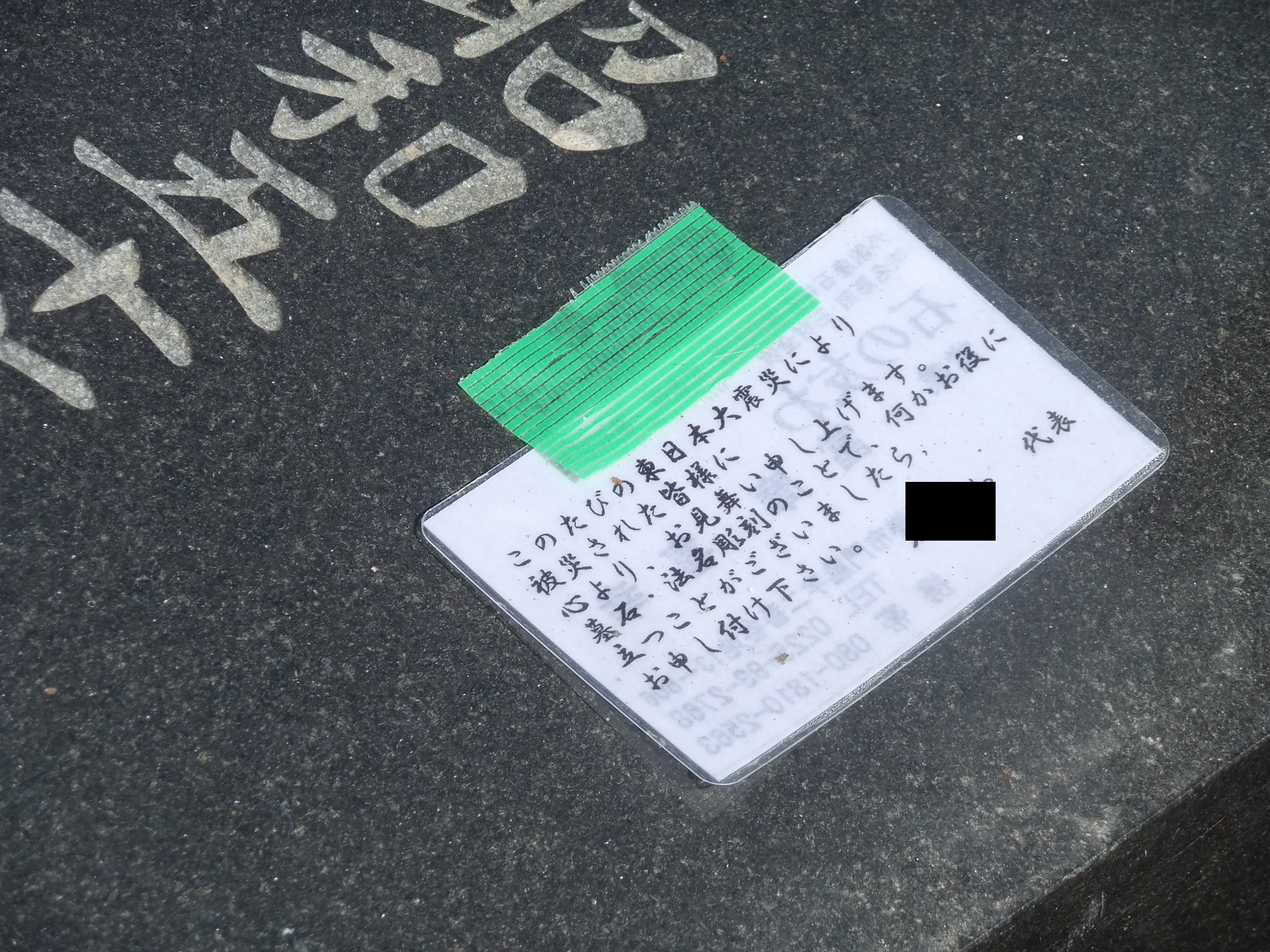 今後の地震対策の参考にさせてもらおうとお墓に入ってみると、倒れた墓石すべてに何か白いものがつけられているのに気づきました。よくみると震災へのお見舞いメッセージが書かれたカード。その裏には墓石業者の名前と連絡先。あきらかに広告です。