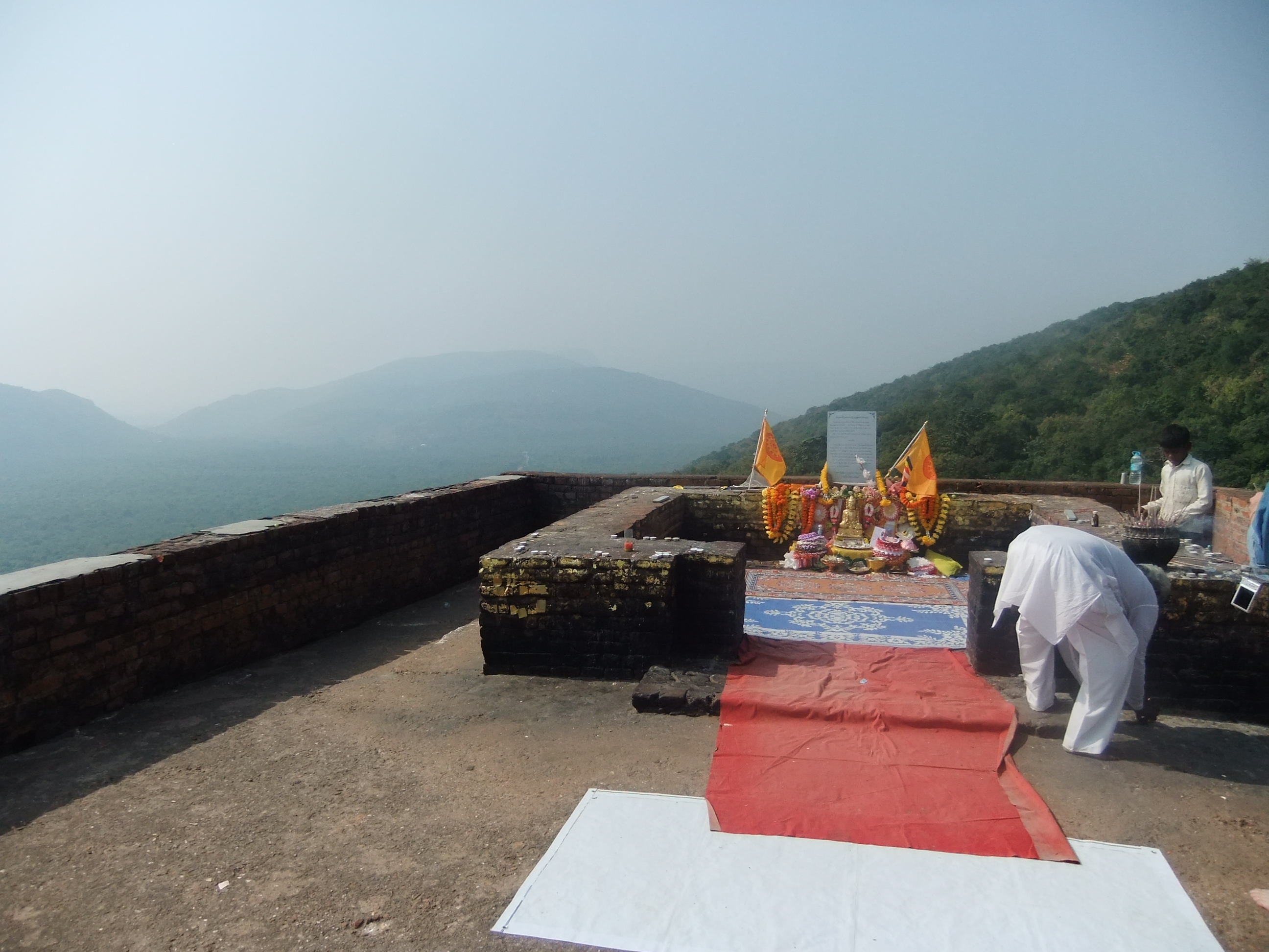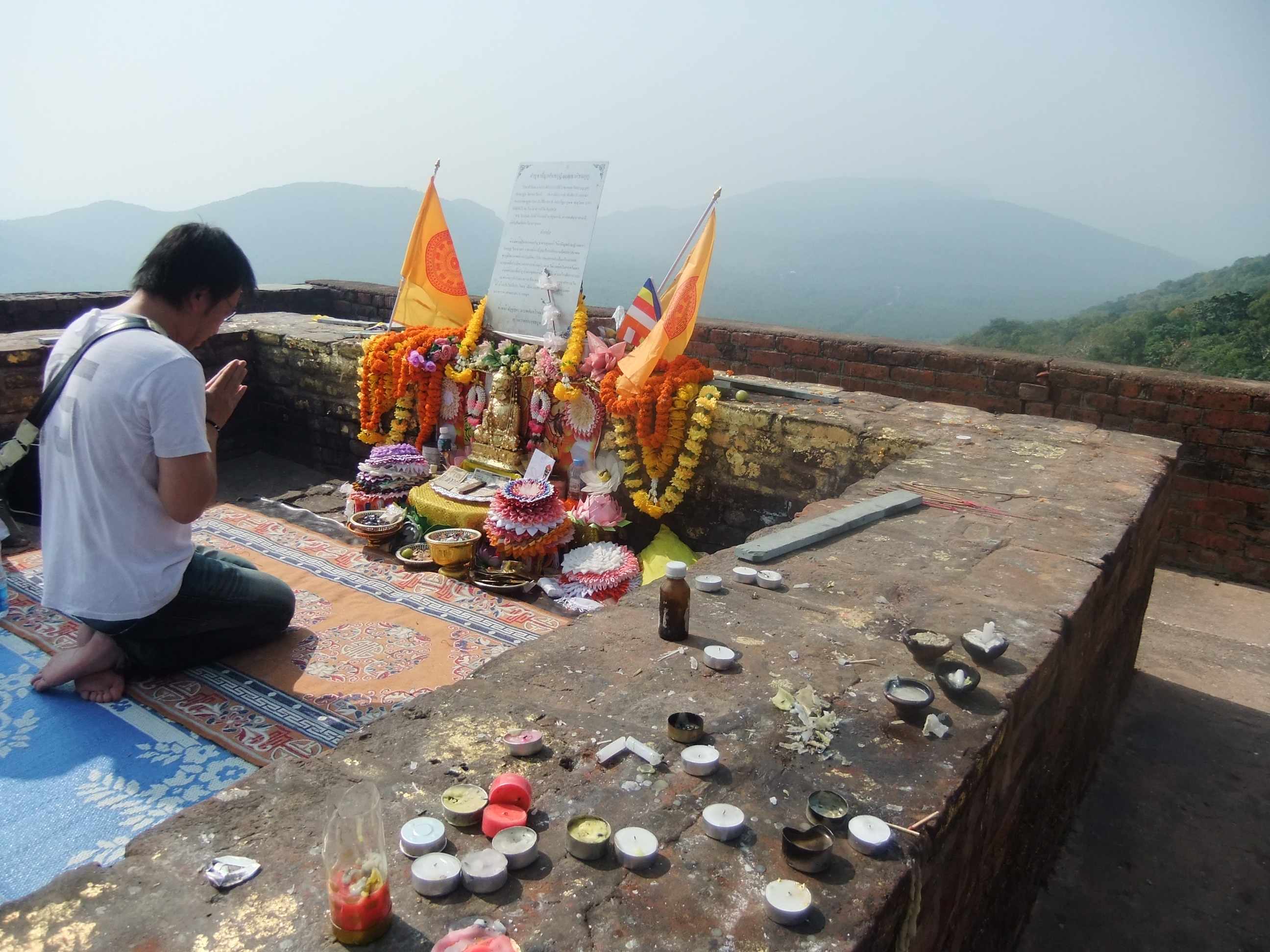 長い参道を息絶え絶えにひたすら登っていくと少し広い場所に出ました。そこに石舞台があり祭壇がおかれていました。ここが釈迦が法華経を説いたといわれる場所です。といってもそれほど広くなく大勢の人が集まれそうにないので、かわるがわる人が訪れ釈迦の説法を聞いて帰ったのでしょう。さすがにかなり高いところまで登ったので、そこからの眺望もまた見事でした。その祭壇を世話するおじさんにどうぞお参り下さいと石舞台に上がらされ祭壇に案内されました。