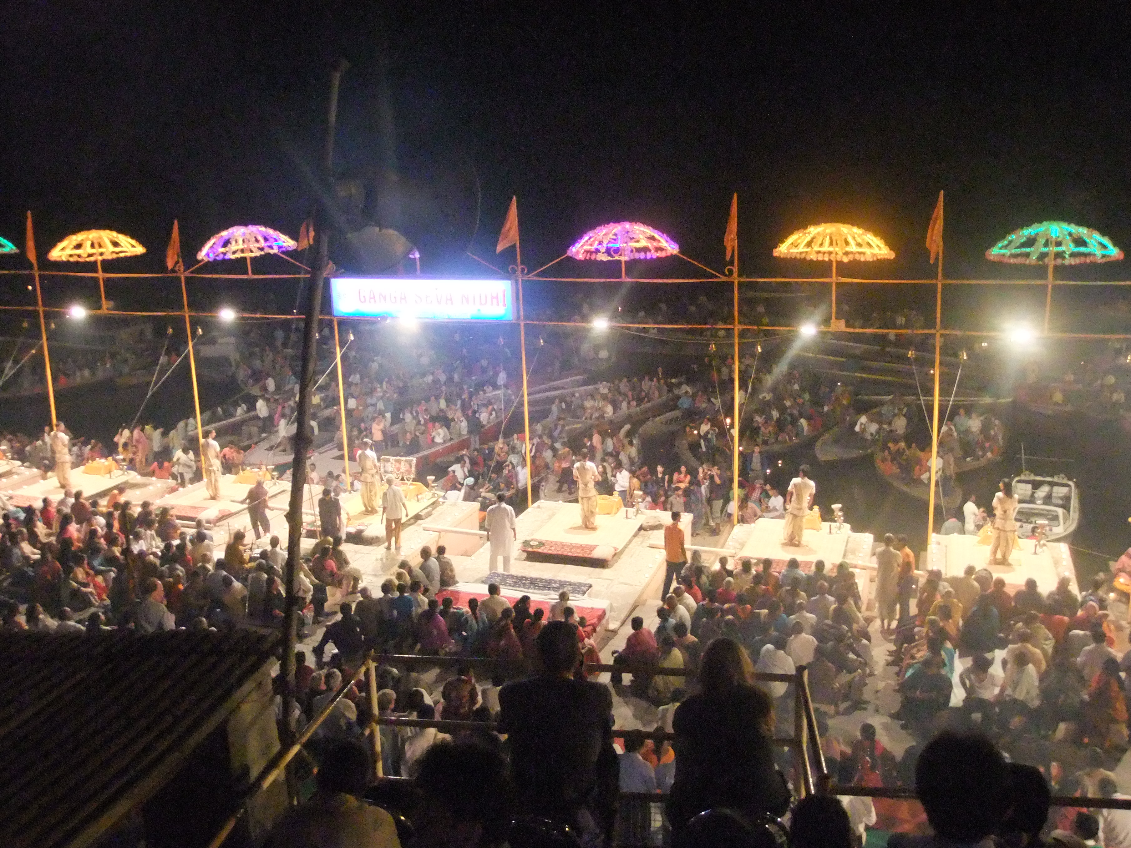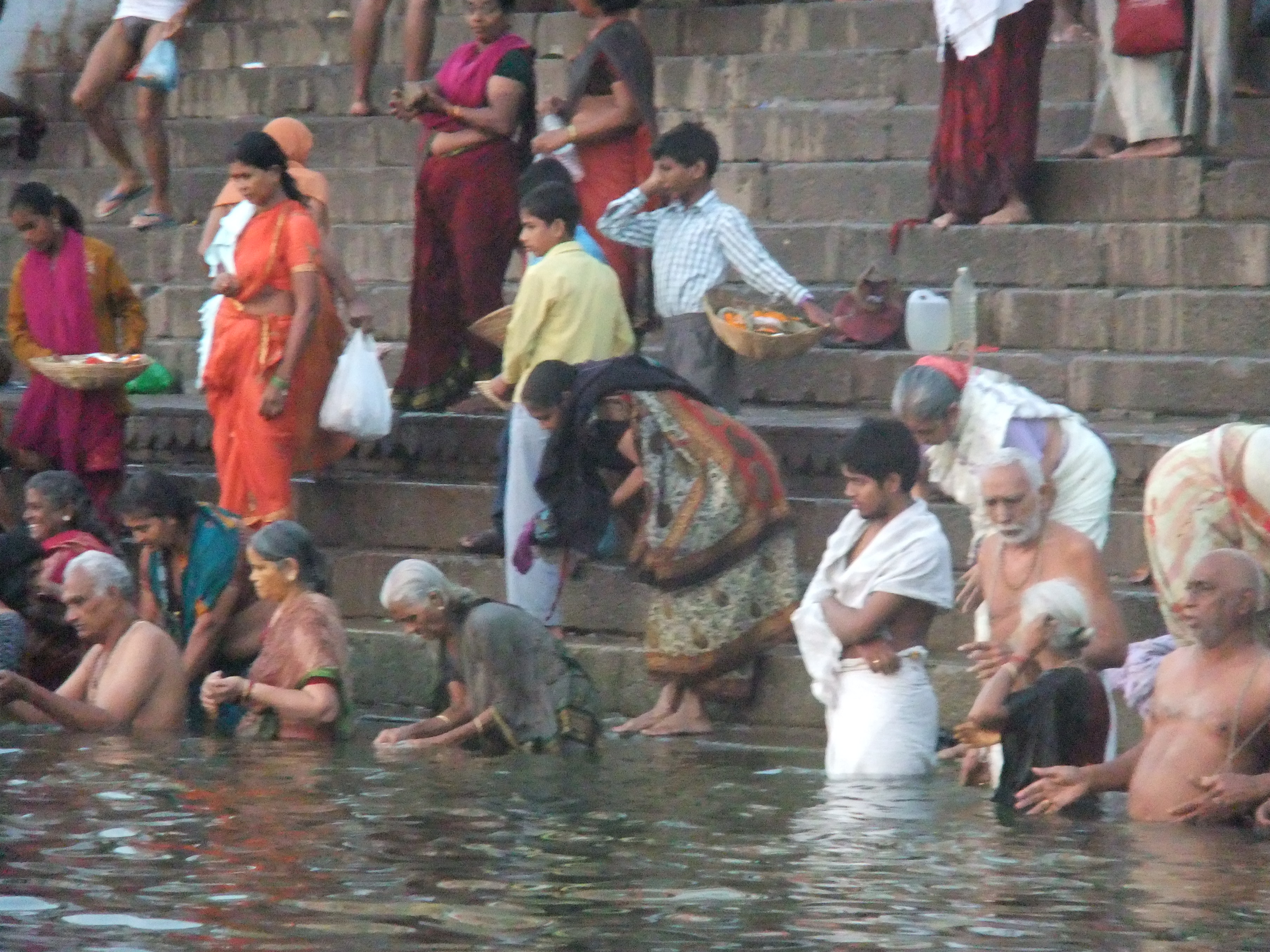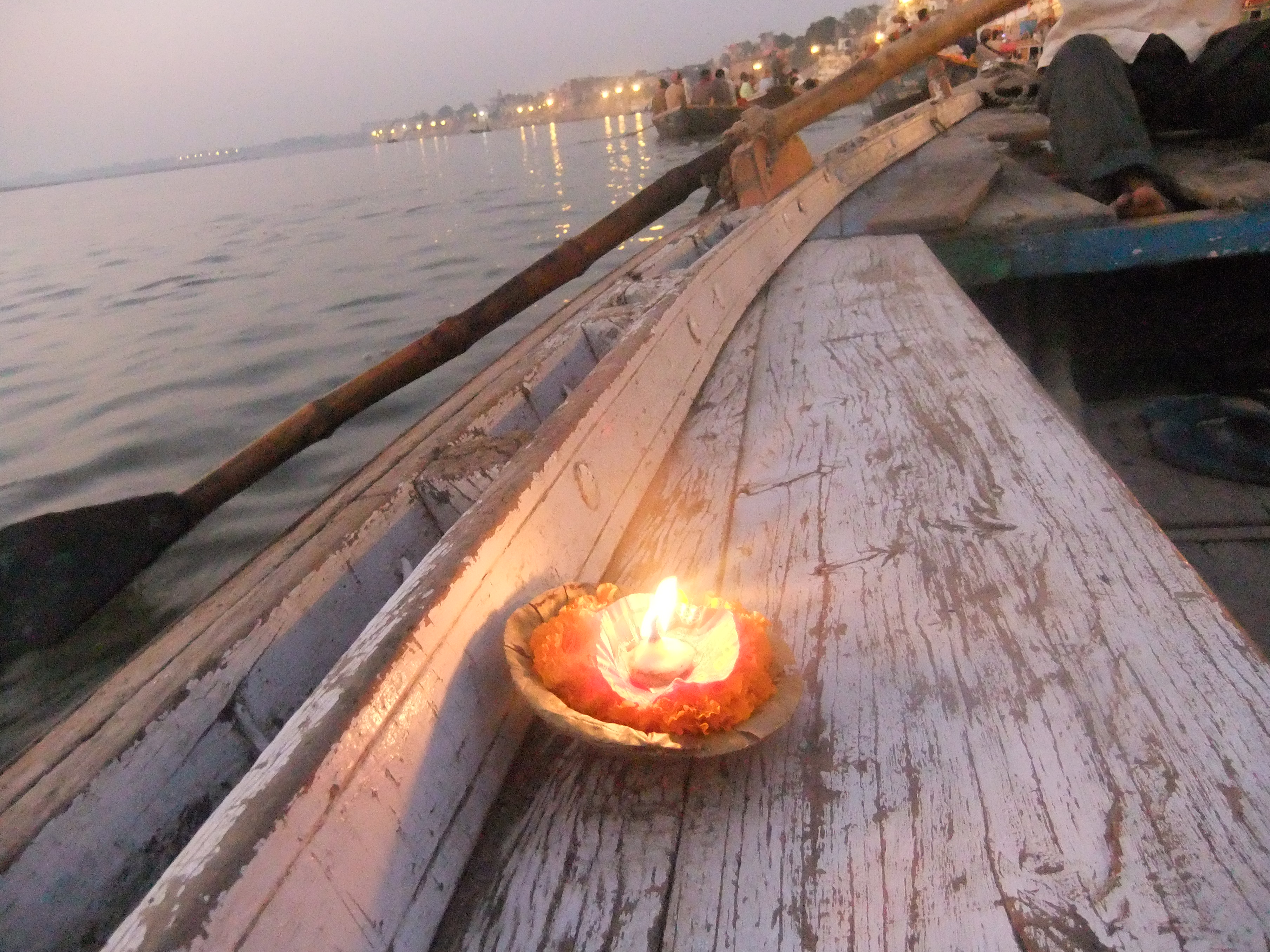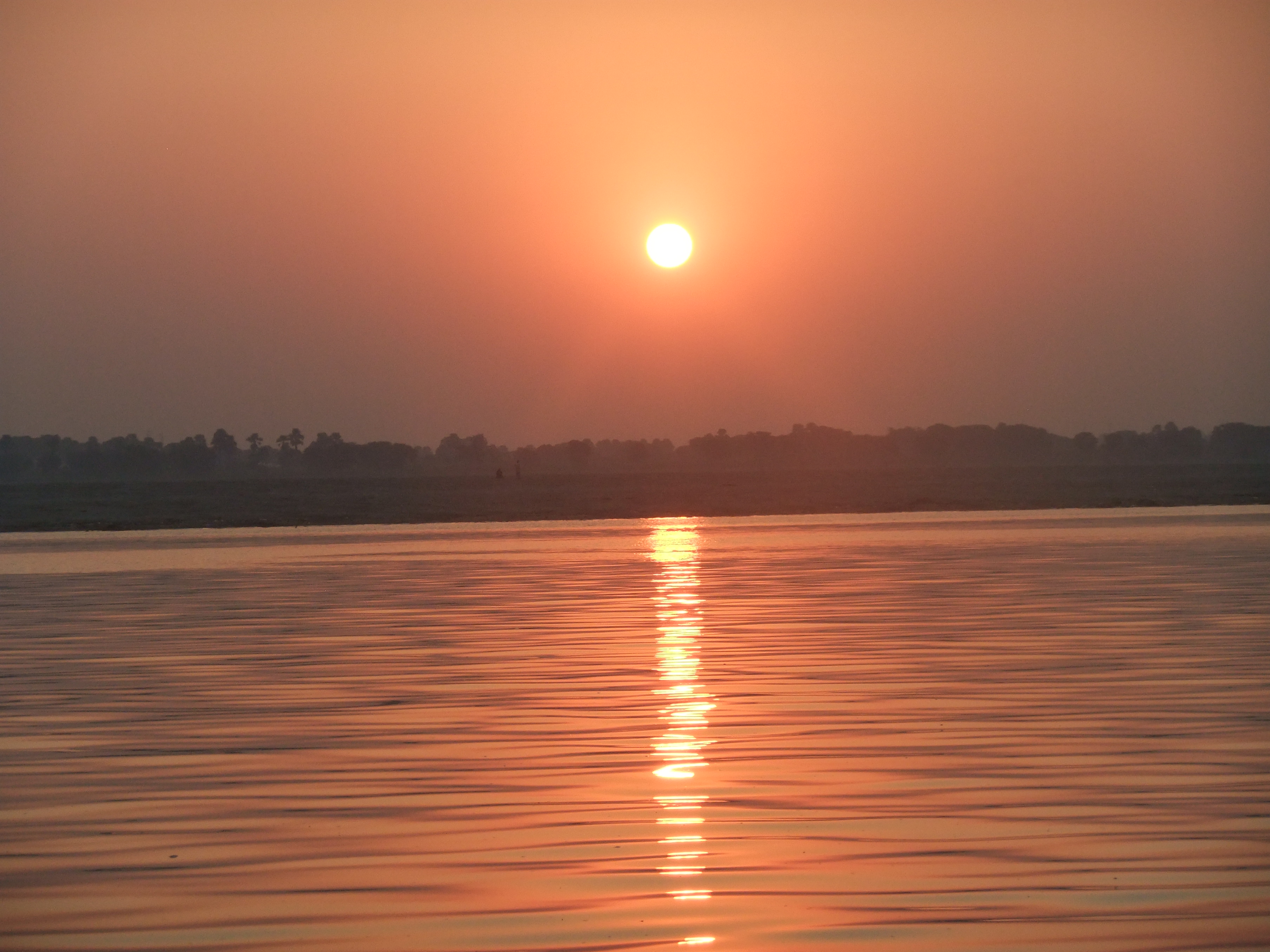 ヒンドゥー教聖地バラナシに着くとそこは埃と騒音と雑踏のすごい街でした。 インド国民の80%がヒンドゥーと言われていますから聖なるガンガー(ガンジス川)が流れるこの街がインドの人々にとっていかに特別な場所であるかという事がわかります。とにかく日に何万という信者がガンガーをめざし、またその巡礼者相手の商売人が半端ない数住んでいます。せまい路地には人も牛もヤギも犬もまったく同じレベルで生活しています。まさにThis is インド です。 到着後、夕刻にまずガンガーの岸で毎晩行うプジャという儀式を観にいきました。 儀式が始まるとインドちっくな音楽とお経、僧侶の振り回す香の煙と炎でその場は幻想的な雰囲気に一変します。会場を包み込む祈りにヒンドゥーでない私も引きづりこまれそうになります。興奮の一夜でした。 そして翌朝は日の出前にガンガーにいきボートに乗りこみます。 まずはバター油を燃やした灯明に祈りを込めボートからガンガーに流します。 ガンガーの朝日です。 ガンガーの岸では、朝日に礼拝し人々は沐浴をはじめます。女性はサリーを着たまま、男性はパンツ姿でした。あたまから水をかぶり口をゆすぎます。岸辺にある火葬場で焼いた遺体の骨や灰から動物の糞尿、洗濯やら様々な生活廃水が交じり合ってけしてきれいとはいえない水ですが、その沐浴の光景をみているとなぜかガンガーの水は清らかに感じます。沐浴まではいきませんがボートから水をすくい少し顔につけてみました。 ガンガーの様子はTVの映像や雑誌の写真で何度も見た事もあり想像出来ましたが、実際現地で心に感じたものは経験のない不思議なすがすがしさでした。ガンガーに来てよかったとあらためて思いました。